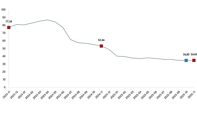 H-ÜFE 2025 yılı Kasım ayında bir önceki aya göre %0,70 azalış, bir önceki yılın Aralık ayına göre %34,07 artış, bir önceki yılın aynı ayına göre %34,93 artış ve on iki aylık ortalamalara göre %37,71 artış gösterdi.